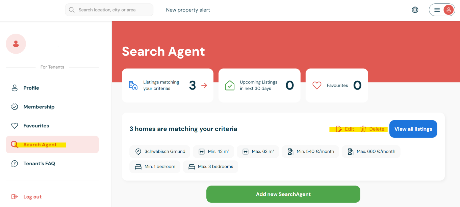 If you have an account, you can manage your SearchAgents directly from your profile. Go to the SearchAgent section, where you can create, edit, or delete your SearchAgents at any time.
